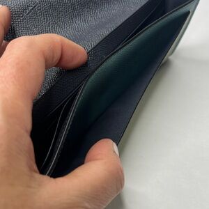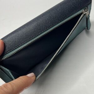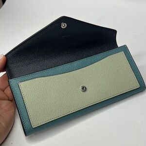 This is a beautiful Coach Leather Colorblock Envelope Wallet. Back zipper compartment. Front snap evelope opens to a front slip in compartment, a back interior slip in and a main compartment with 8 credit card slots. Excellent condition. No issues at all. No odors. No stains. 7.75” x 3.5” x .75”