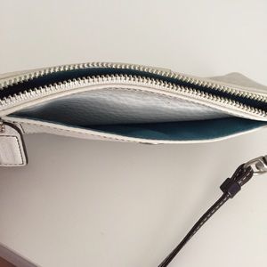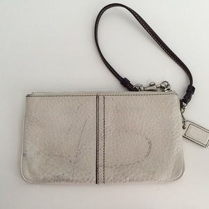 This cream color Wristlet goes well for all season. Minor staining some the brown leather, it's been sitting in my closet for a while. 4.5 H x 8.5 w