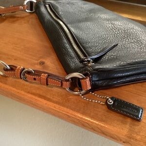 Authentic Coach leather handbag with raspberry satin lining and tan strap with silvertone hardware. Bag measures 13” X 8” X 3”. The inside of the bag features a zipped closure and two additional pockets. There is a large zippered pocket across the back of the bag. Excellent condition.