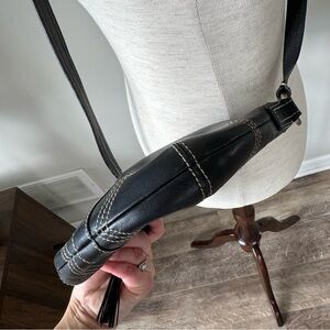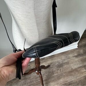 Sleek and stylish black leather crossbody bag with tassel detail. Perfect for any occasion.