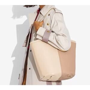 This Coach Bea Colorblock Tote in soft ivory and taupe leather features a clean colorblock design with gold-tone hardware.