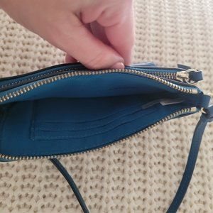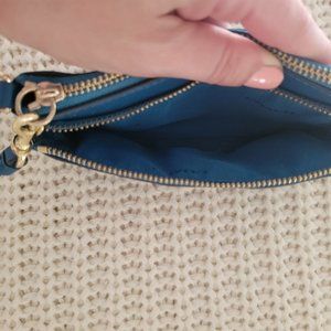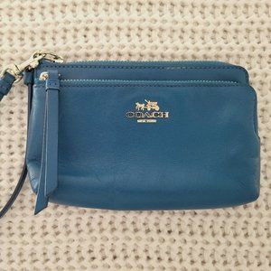 Greenish blue COACH leather wristlet. 2 compartments with zipper closure for small phone, cash, coins & credit cards. Sold as is, no returns accepted.