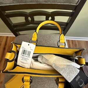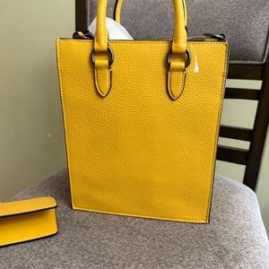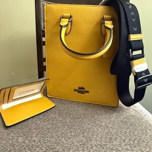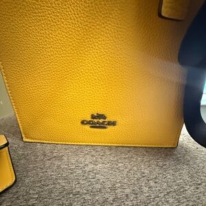 Coach leather Dylan tote Bag crossbody with matching wallet. Measurements Length: 8.0" Height: 9.75" Width: 3.0" Materials Refined pebble leather - Fabric lining Handle - Handles with 3" drop Strap Detachable strap with 28.5" drop for shoulder or crossbody wear - Features Inside multifunction pocket - Zip-top closure