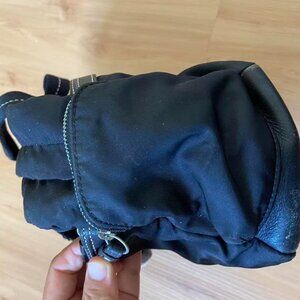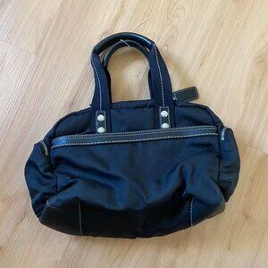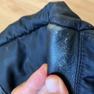 Nylon Body with Leather. it's still nice . There's a little bit damaged on the handle. Same flaws in the bottom of the purse..