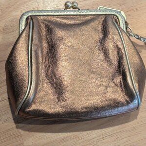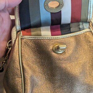 Coach Legacy 65th Anniversary Metallic Gold Leather Wristlet Kisslock Frame Bag. Striped lining