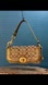 This trendy little shoulder bag is made with Signature C Jacquard, smooth gold pebble leather and bold brass hardware, measures approximately 9 1/2” wide, 5 1/2” high, and 3” deep. The 1” to 1 1/4” thick shoulder strap features and a large and stylish brass dog leash clasp with a 7 1/4” drop, and fits comfortably on the shoulder and under the arm.