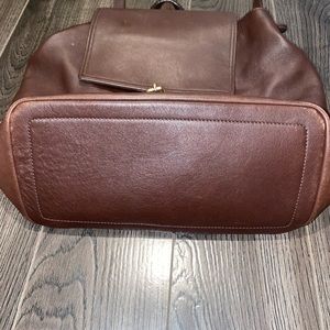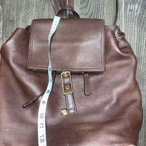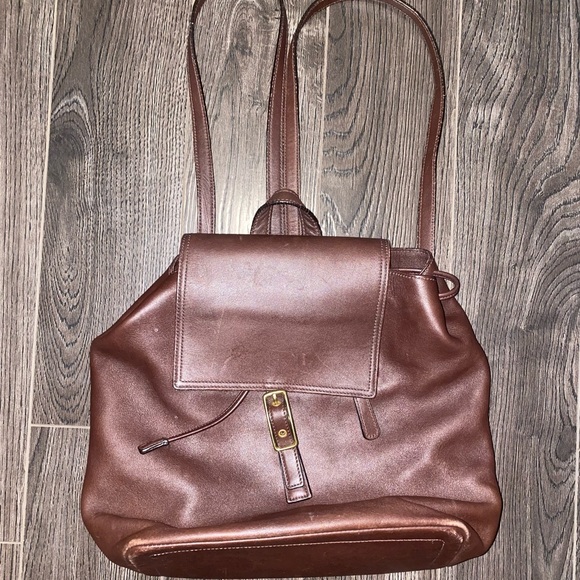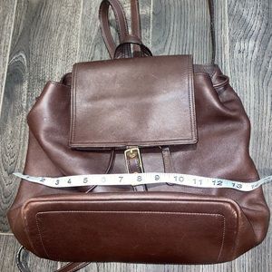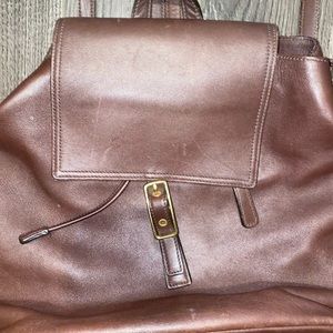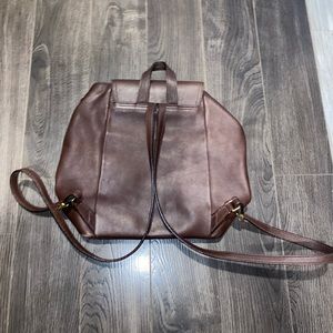 All brown leather, vintage style backpack. Medium size with strap and button closure. Clean interior and minor signs of wear on exterior as pictured. Adjustable straps.
