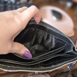 This used wristlet has one opening in the front, and when you open the zipper, there are three slots for storage and six slots to hold credit cards. The major call-outs are on the actual wristlet it needs to be fixed or replaced, as you can see in the photos and on the zipper, and there's some damage which is in the photos as well. The size of the wristlet is 7 1/2 in Long and four and a half inches tall. The hardware is in good condition. The leather is in great shape.