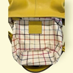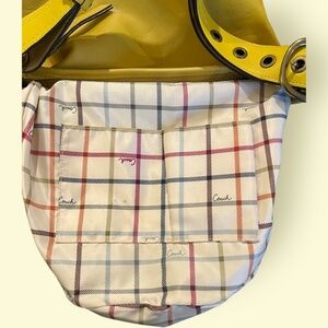 Coach Legacy Ergo Bucket Bag, style J0769-11422, in soft glove-tanned Sunflower leather with plaid lining and zip closure. Adjustable grommet strap and classic Legacy design.Great condition with normal wear. Small pen marks inside and minor surface variations shown in photos. Bright, cheerful, and collectible Coach classic.