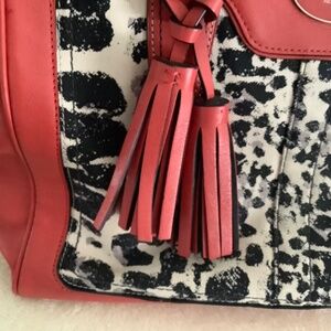 Coach Legacy Haley Red Leather and Leopard Print Cloth Trim Satchel With Tassel