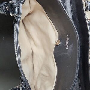 Coach legacy haley satchel donegal print. This chelsea style convertible top bag is the perfect carryall, plenty of room and pockets. 4 studded feet on the bottom of the bag, 2 patent leather wrapped shoulder/ carry straps with a drop of 7.5", 1 removable and adjustable shoulder strap (adjustable from 18.5" drop to 20.5" drop). Full length zipper opens up to an inside zippered pocket (9" x 6.75"), and 2 open slip pockets (4.5" x 4.5" and 3" x 4.5"). Outside front of the bag has a large slip pocket with a magnetic button closure, the back of the bag has a large zippered pocket (9" x 5.75") Some light scuffs on the bottom leather, pen marks inside the bag, and some light staining on the fabric near the top opening of the bag (see pics). Approximate bag measurements: 14" x 5" x 10".