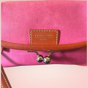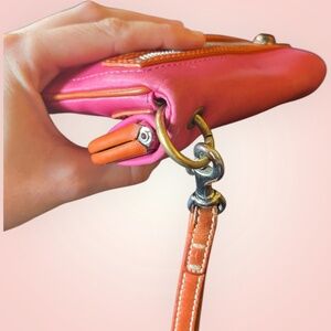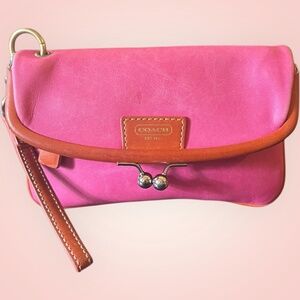 Authentic Coach Legacy Kisslock Leather Wristlet in vibrant pink with orange trim and multicolor striped satin lining. Silver-tone kisslock closure with front zip pocket and detachable wrist strap. A rare mid-2000s Coach piece known for its bold colorway and signature Legacy lining. Very good condition with minor surface wear. Clean interior. Measures approximately 7.5” W x 5” H. Made in China.