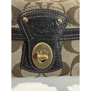 The Coach Legacy Kisslock Stripe Wallet Turn Lock is a stylish and practical accessory for women. Made of leather with a striped canvas fabric, this wallet features multiple credit card slots for easy organization. The turn lock closure adds a touch of sophistication, while the brown color gives it a classic and versatile appeal. Perfect for everyday use, this wallet is a practical yet fashionable choice for any woman looking to keep her essentials secure.