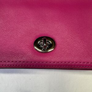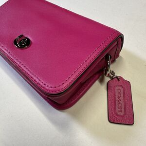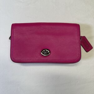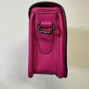 This is a Coach crossbody bag crafted from genuine glove-tanned leather in a bold magenta/fuchsia tone. Features include: