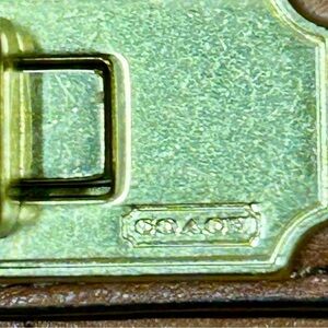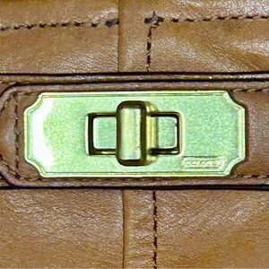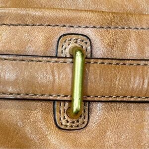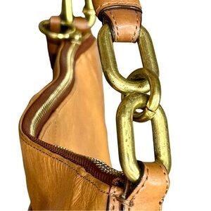 This Coach Legacy hobo shoulder bag is crafted from supple camel-colored genuine leather with signature brass-tone hardware and a turn-lock front detail. It features a comfortable wide leather strap with oversized chain links, a zip-top closure, and a spacious interior lined in satin with multiple pockets for organization. The front also includes a magnetic snap pocket for easy access to essentials.