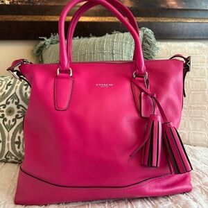 The Coach Legacy Leather Rory NS Satchel 19892 in Fuschia Pink is a stylish and versatile handbag perfect for any occasion. Made of high-quality leather with silver hardware accents, this rectangular satchel features double handles and a zip closure. The interior is lined with fabric in a beige color and includes inner pockets and an adjustable strap for added convenience. With tassel details and a unique design, this Coach bag is a fashionable choice for any woman looking for a chic and practical accessory.