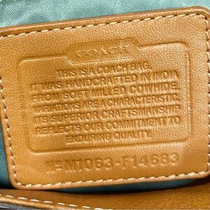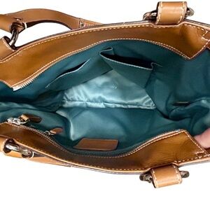 This Coach Legacy tote is a timeless, functional everyday bag crafted from soft white pebbled leather with tan leather trim and silver-tone hardware. It features double leather shoulder straps, a front zip pocket, and a spacious interior with multiple compartments lined in a beautiful teal satin fabric.