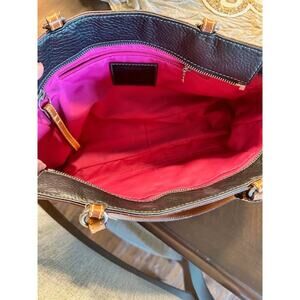 Authentic Coach Legacy Leather Tote in rich brown pebbled leather with double contrast top handles in cognac leather. Style number F09669-F08E97. Features silver-tone hardware, signature hangtag, and front slip pocket with round Coach emblem. Zip-top interior lined in vibrant raspberry pink fabric with a zip pocket, two slip pockets, and a large main compartment.