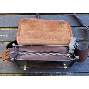 This is a fanny pack/belt bag style composed of a leather body and suede upper flap. Color is brown suede upper turnlock flap, with grey leather body.