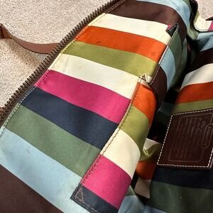 Discover the Coach Legacy Luci Dome Satchel, a stylish companion for your everyday adventures. Crafted from rich brown leather, this medium-sized satchel offers a perfect blend of elegance and functionality. With its double handles and turnlock closure, it provides easy access to a spacious interior lined with vibrant multicolor fabric. Multiple pockets ensure your essentials are organized, making it ideal for casual outings or a day at the office. While it shows some signs of wear, this bag still exudes charm and sophistication.
