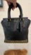 The bag is crafted from leather and features an exterior studded base, a top zip closure, and dual top handles.