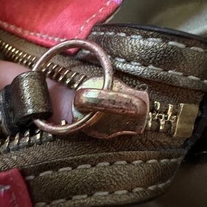 Condition: New with tags. The zipper pull on the purse and the wristlet has a pink stain like look on it. The metal charm also has some dings on it.
