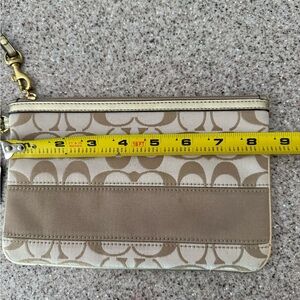 This Coach clutch showcases the iconic signature monogram in a sophisticated tan hue, complemented by a sleek metallic wrist strap. Its compact design makes it an ideal accessory for both casual outings and formal events, offering a touch of elegance to any ensemble.