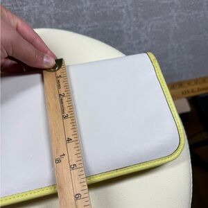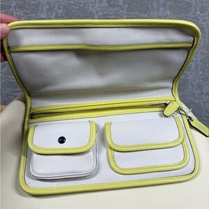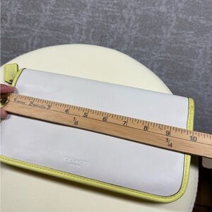 I believe this is called the coach legacy clutch, as shown there are some light scuffs and marks but still in really good condition! Super cute clutch.