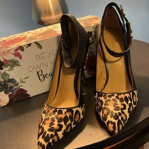 COACH Leopard print and Black Leather Pump looks classy and is extremely comfortable to wear all day long, perfect for any occassion! Slip-on style. Leather upper. Leather lining and footbed. Pointed toe, ankle strap with gold Coach-branding on closure on the strap. Pencil sleek 4” heel with gold plate. Leather outsole. Inside has some peeling (see last picture), otherwise in great condition.