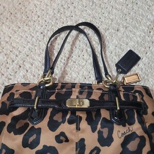 Stylish Coach shoulder bag with leopard print. Features black accents and gold hardware. Perfect for any occasion.