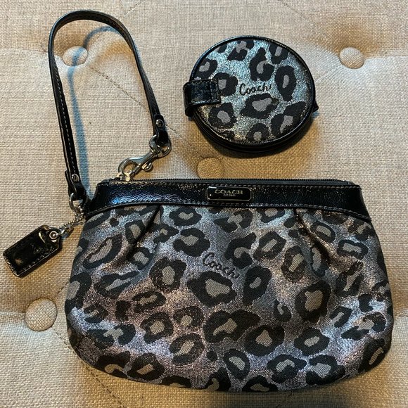 Coach Leopard Print Silver & Black Wristlet with Matching Mirror