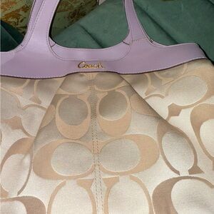 NWOT Gorgeous Coach Authentic Signature Lexi Bag in a soft tan color with soft purple lining on the inside.