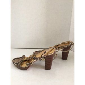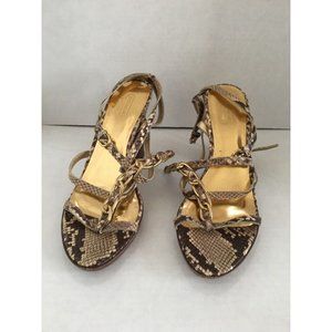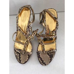 Up for your consideration is a beautiful pair of women's Authentic Coach sandals/heels in a size 8.5 B. the style name is "Libertie". They have a Python Embossed Upper, and a Gold insole. They also have a chain detail on the front. They have 2 straps that can be adjusted. They retail for $248 + tax at Coach.