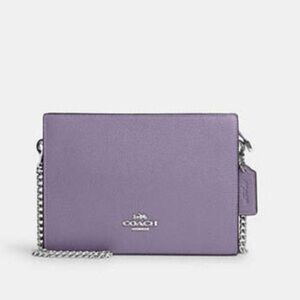 The crossbody strap is a silver chain. The bag features a zip closure and a detachable strap accessory.