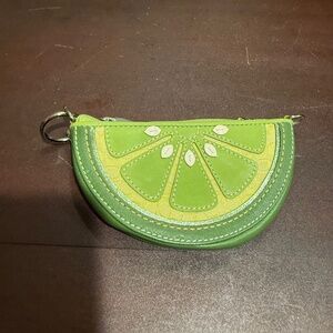 Half circle citrus slice shape coin purse purchased from the Coach Store from the Coach store in the South Park Mall in Charlotte, NC. Stored in a clear plastic sweater box in a non smoking home. Green leather pulse yellow/green fabric interior panels, stitched citrus segments, white enamel seed appliquéd with a silver chain and key ring. Includes a Coach embossed leaf shaped hangtag, zipper closure at top curve. This was originally sold as a summer novelty. Gently used and deeply loved.