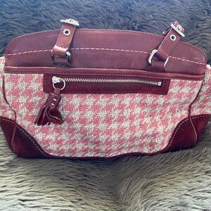 Beautiful Limited Edition 2004 Coach Vintage Wool Houndstooth Tote Bag Satchel, Style no. 7480! Fabulously crafted with beautiful wool trim with luxurious burgundy high end glove tanned leather combined with crisp suede leather, complete with coach embossed burgundy nickel enamel hangtag.