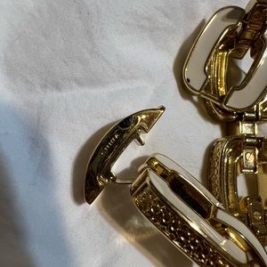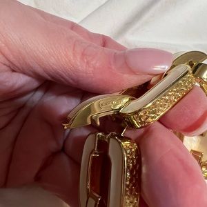 Coach link bracelet. This is a solid bracelet and a definite statement piece! Small paint chip in 2 places. Latch works great! Yellow Gold and cream