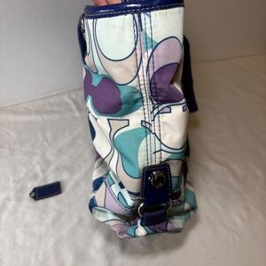 The Coach Logo Pattern Kyra Daisy Scarf Print Nylon Shoulder/Crossbody Bag F17178 is a stylish and versatile accessory for women. This medium-sized tote features a vibrant multicolor exterior with a blue lining and silver hardware accents. With inner and outer pockets, a zip closure, and a unique Coach logo pattern, this bag is a classic designer piece that adds a touch of flower-themed flair to any outfit.