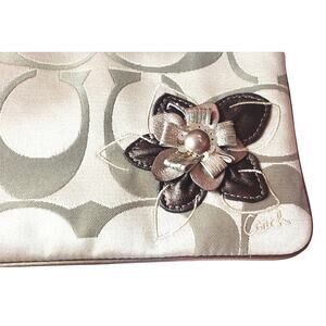 Stay effortlessly stylish with this timeless Coach Signature Logo Wristlet, featuring a beautifully embroidered leather flower in rich pewter and brown tones. Whether you're going for a casual, boho, or designer-inspired look, this wristlet makes a statement while keeping your essentials close.