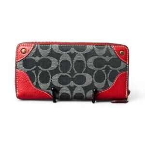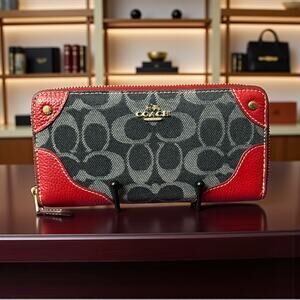 Coach Long Signature Wallet Xip Around Denim and Red