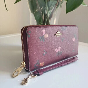 CF355 - Printed coated canvas and smooth leather - Twelve credit card slots - Full-length bill compartments - Inside zip coin pocket - Zip-around closure - Detachable wrist strap - 7 1/2" (L) x 4" (H) x 1" (W) - Fits most iPhone and Samsung Galaxy phones