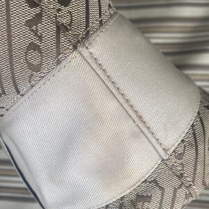 Good used condition has stains on tan stripe a light yellow stain on front and top. Handles have light wear on edges see photos