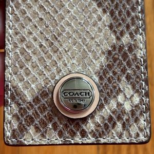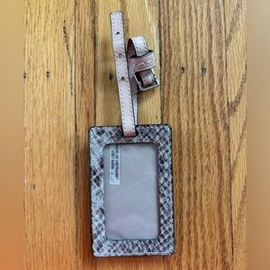 Leather luggage tag with Tan, gray, and brown snake-print and gold Coach emblem. I have the original address insert but with my name and info on it. Happy to send with the tag if you want to blank out my info and put yours.