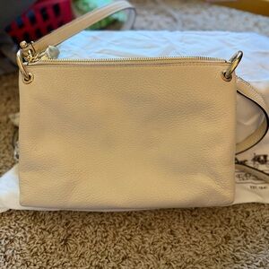 Chic Coach double zip crossbody bag in white leather. Accented with a signature print scarf for added flair.