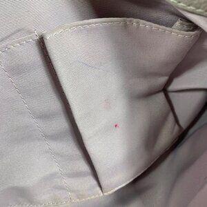 Exterior has minor wear on the bottom corners with darker areas. Interior fabric has marks that have not been treated. Minor scratches on hardware.
