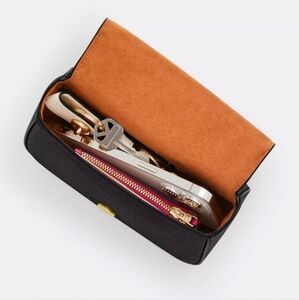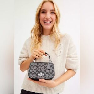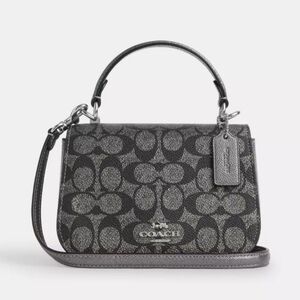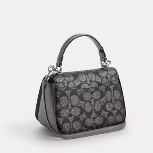 Pearlized Signature coated canvas and metallic crossgrain leather Two credit card slots Snap closure fabric lining Top handle with 2 3/4 drop Outside open pocket Detachable strap with 22 3/4 drop for shoulder or crossbody wear 7 (L) x 5 (H) x 3 1/4 (W) Style No. CX576