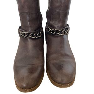 Gorgeous chocolate brown riding boot. Zip up to pull on. Gunmetal chain detail on the front at ankle. Great condition! Some light scuffing increasing but that’s just how the leather wears. Lots of life left!
