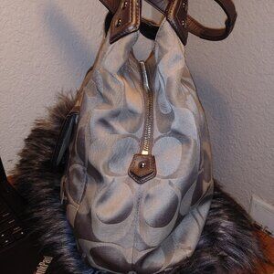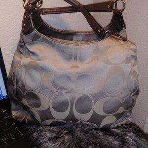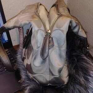 Ultimate in organization. This is one of my favorite Coach designs in a handbag because of the 3 separate sections. The center section having the added security of a zipper. This traditional canvas with leather trim and large signature C's is a vintage classic for Coach. The neutral color way will carry you through any outfit in your wardrobe. This preloved handbag is in great condition with very little wear showing on interior or exterior. The interior only showing a little in makeup and pen markings. The hardward is a light shine silver and minimal and the leather strap is in good condition considering its vintage age. You will love this classic.