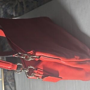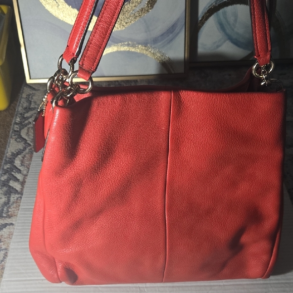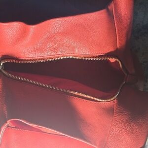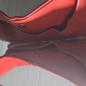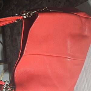 Elegant orange leather shoulder bag with a soft pebbled finish. Spacious interior and comfortable double straps for everyday wear. Gold-tone hardware adds a polished touch. Versatile red color complements many outfits.