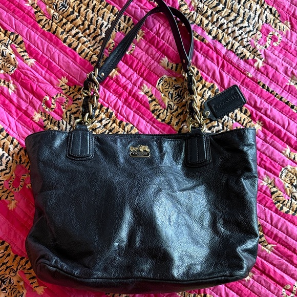 Coach vintage calfskin leather. Purple satin interior, chain handle, zip closure. No smells lots of life left.